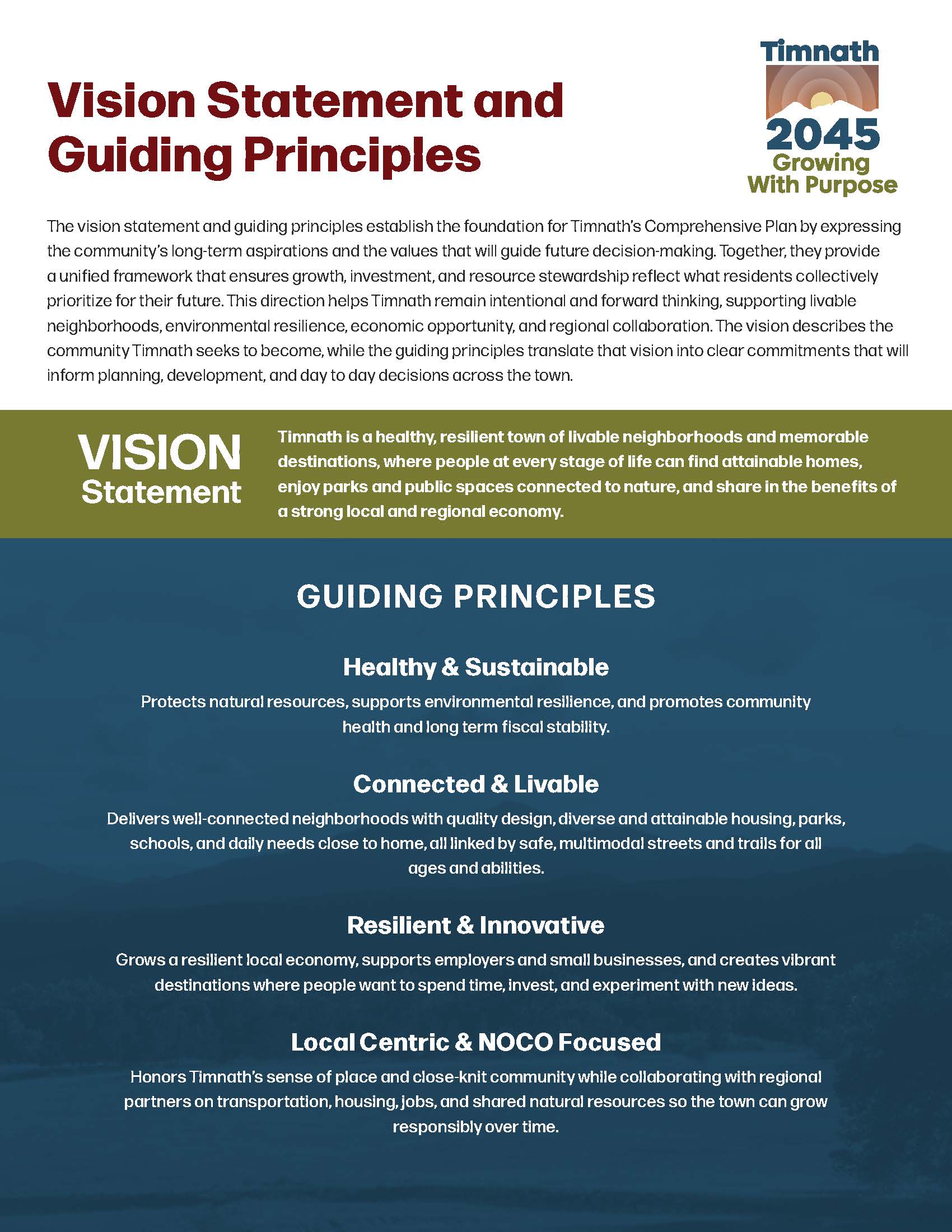 Timnath’s Comprehensive Plan update is guided by a clear vision for the future and a set of guiding principles shaped by community input. Together, they describe what residents value most and how those values should guide decisions as the town grows and changes.